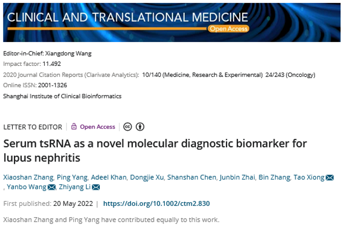 2022520日,yl23411集团官网熊涛教授团队和南京鼓楼医院医学检验科李智洋研究员团队合作,在影响因子为11.492的高水平期刊Clinical and Translational Medicine在线发表了题为《Serum tsRNA as a novel molecular diagnostic biomarker for lupus nephritis》的文章。该文分析了狼疮性肾炎(lupus nephritis, LN)血清中tsRNA的表达谱,首次筛选到LN组中显著高表达的tRF-Ala-AGC-2-M4,并对其诊断价值和分子功能进行了评估和预测。团队成员研究生张孝山和南京鼓楼医院医学检验科杨平主管技师为共同第一作者,熊涛教授为本文的第一通讯作者。