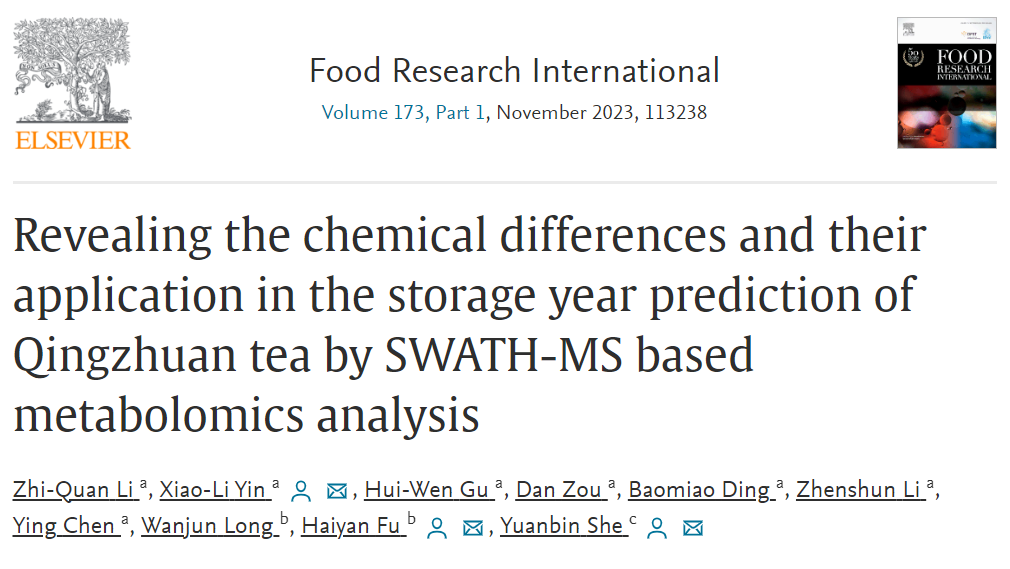 近日,我院食品科学与工程专业2021级硕士研究生李志泉以第一作者身份在食品领域Top期刊《Food Research International》(IF=8.1,中科院一区)上发表了题为“Revealing the chemical differences and their application in the storage year prediction of Qingzhuan tea by SWATH-MS based metabolomics analysis”的学术论文。硕士生导师尹小丽副教授为论文共同通讯作者,yl23411集团官网为第一作者单位和通讯作者单位。