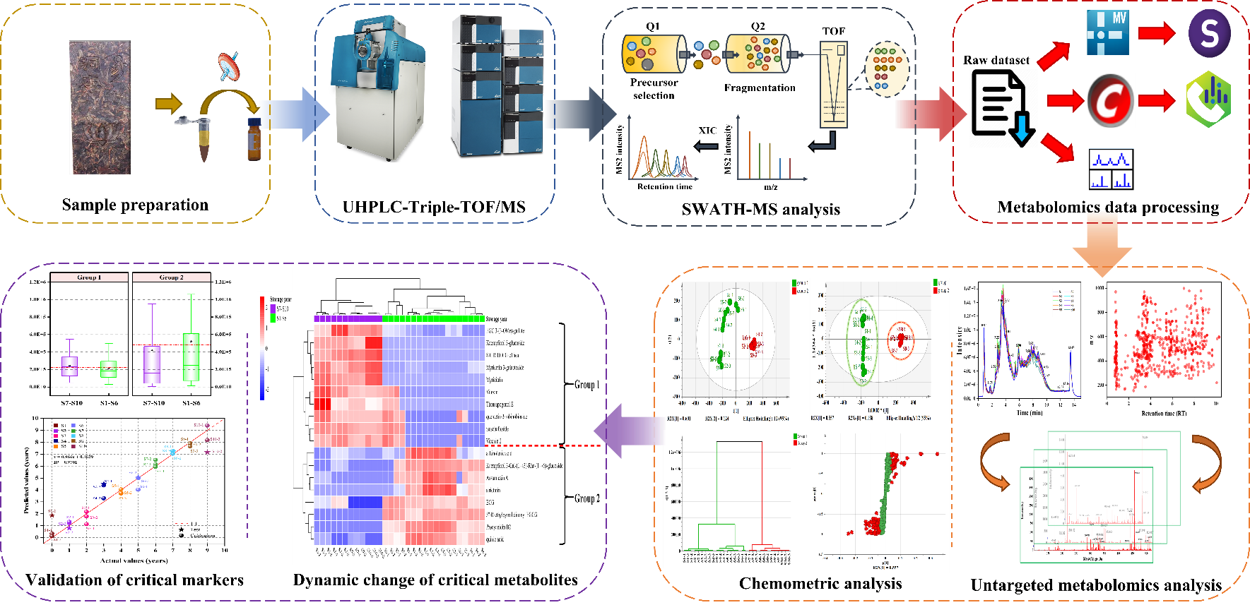 该研究利用基于SWATH结合UPLC-Triple-TOF/MS的非靶向代谢组学方法,对不同贮藏年份的青砖茶小分子代谢物动态变化进行全面分析,结果表明,通过主成分分析(PCA),这些QZT样品被大致分为两类。经过正交偏最小二乘判别分析(OPLS-DA),18个差异化合物被认为是QZT贮藏年份变化的化学标记物。另外也建立了青砖茶年份预测模型,预测效果良好。该研究揭示了QZT在不同贮藏年份的化学差异,为贮藏黑茶的质量评价提供了理论依据。