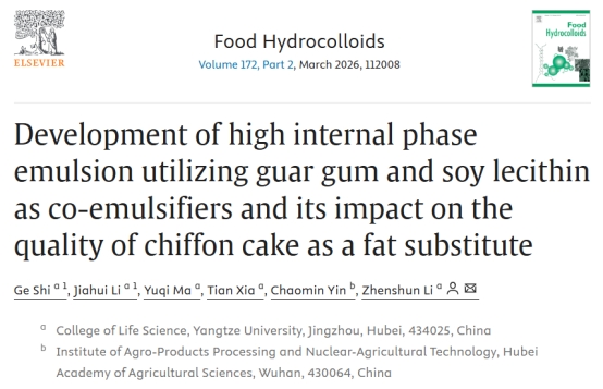 近日,我院食品高分子团队在食品领域Top期刊《Food Hydrocolloids》(IF=12.4,中科院一区)上发表了题为“Development of high internal phase emulsion utilizing guar gum and soy lecithin as co-emulsifiers and its impact on the quality of chiffon cake as a fat substitute”的学术论文。团队负责人李真顺教授为论文通讯作者,论文第一作者为食品科学与工程专业2023级硕士研究生史歌,yl23411集团官网为第一作者和通讯作者单位。