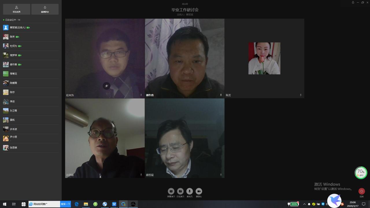 会议伊始,学院党委副书记谢作喜介绍了我院2020届毕业生空中双选会的报名情况:截至3月17日,本次双选会报名企业共113家,审核通过企业84家,提供岗位共255个,招聘总人数达5113人,报名学生共415人,简历投递人数为160人,简历投递总份数达481份。并将毕业班各班报名、投简历以及就业情况分别一一进行了介绍说明,希望班主任多次提醒督促学生投简历。随后各班班主任针对本班就业情况依次发言,提出目前存在的就业工作难点和建议,其中反映比较集中的问题包括:班主任对于本次双选会具体流程不是很清楚,一部分同学就业积极性不高,考研二战以及准备考研复试的学生完全不尝试找工作,以及部分企业不愿意接受疫情较重的湖北地区的学生。同时,班主任们也提出了一些好的建议,例如推荐湖北省内的学生选择就近在省内就业,建议同学们针对不同岗位制作内容相匹配的简历等,学院就业专干张思祺对本次双选会具体操作流程也做了详细的解释和说明。另外,针对毕业生目前还存在的完成毕业论文有困难的情况,学院教学副院长杜何为也做了相关说明,表示学院针对论文事宜做了预案。学院党委书记蔡哲斌针对就业工作提出了要求班主任们克服困难,进一步将就业工作仔细落实,做到一生一策,并且协调好考研工作,建议同学们不要寄希望于一个方面,要多给自己留后路。最后,高院长作总结发言,指出就业工作是一项长期的工作,不仅仅要将此次双选会举办好,让同学们都参与,并且还要在之后的一段时间继续紧抓就业工作,让同学们都就好业。
