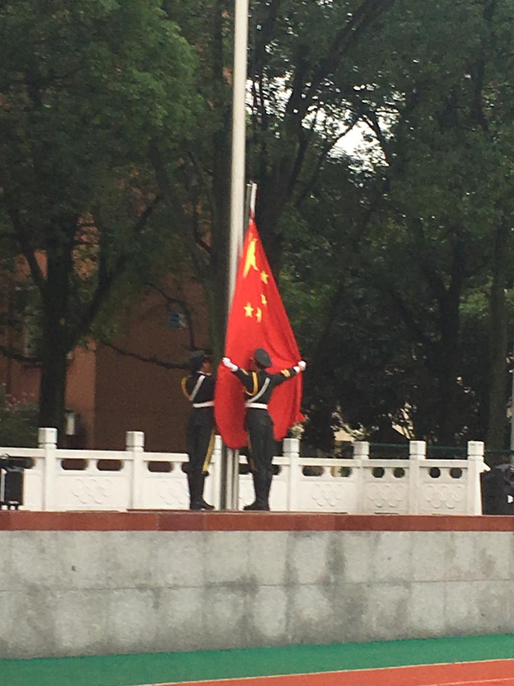 7点整,国旗护卫队护送五星红旗入场,在庄严的国歌声中,五星红旗冉冉升起,全体师生注目肃立,向国旗致敬。