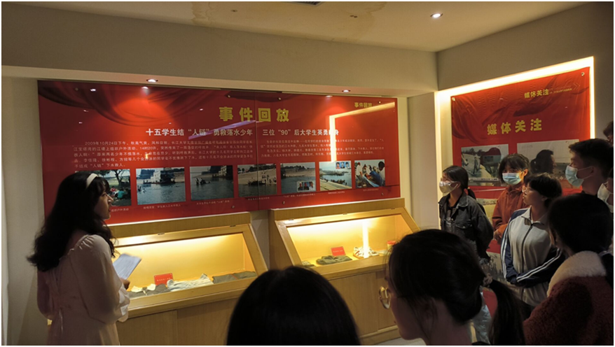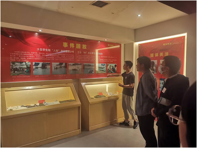 馆内的图片、影像、物品加上讲解员的讲解让同学们切身感受到陈及时、何东旭、方招三位烈士见义勇为的无私壮举。2009年的10月24日,两名少年落水,十五名长大学子手牵着手搭起了生命之桥—人链,最终两名少年获救,而陈及时、何东旭、方招三位学生却永远地留在了汹涌的江水中。