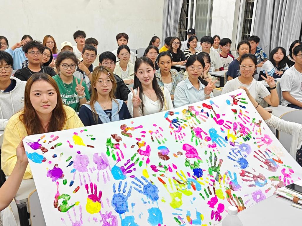 活动尾声,全体参与者在纪念布上按下了五颜六色的手掌印。形态各异的手掌印汇聚成一幅生动的集体画卷,既象征着2025级生科新生的初次相逢与集体归属感,也寓意着他们将携手并肩,在未来的求学路上共同成长。