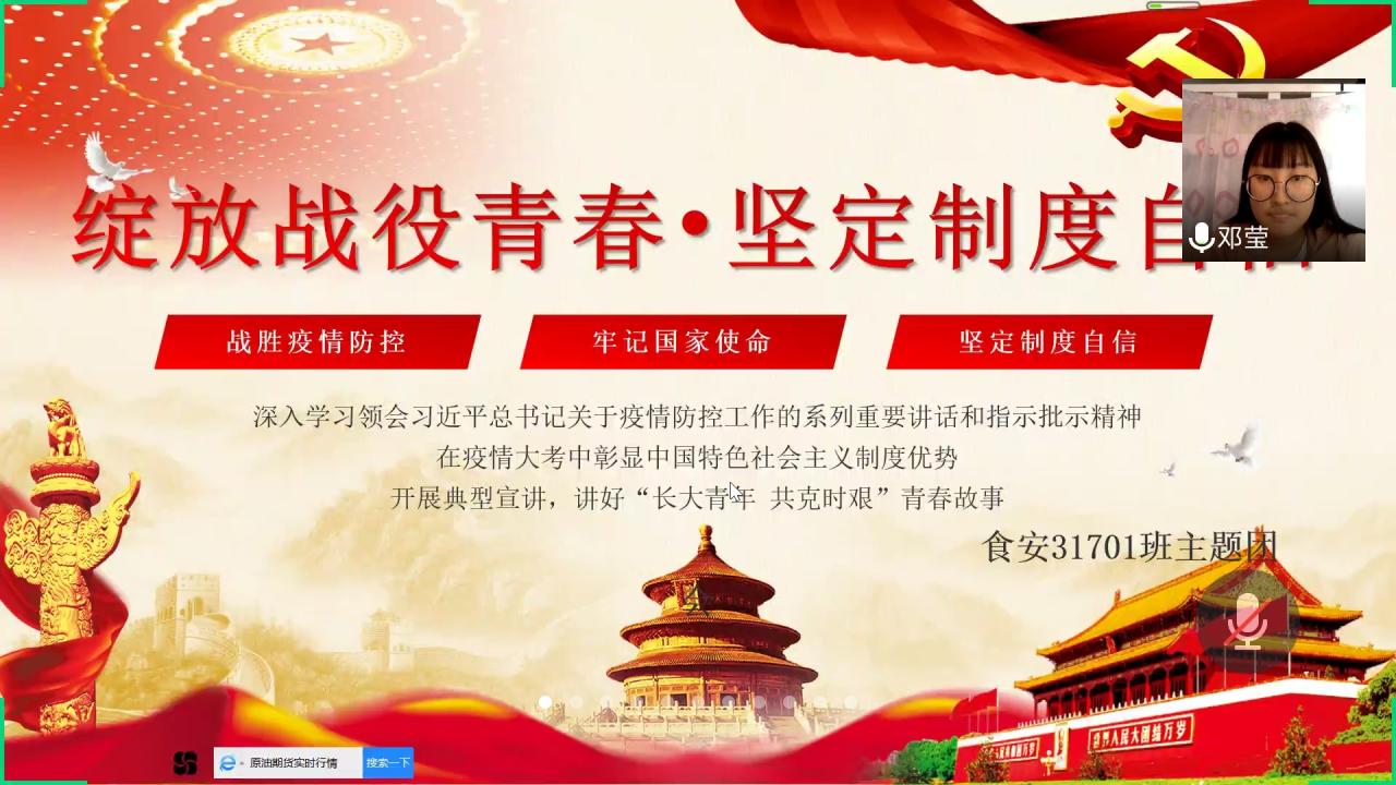 (通讯员:邓莹)2020年5月14日下午16:00,食安31701“绽放战役青春,坚定制度自信”主题班团会于腾讯会议顺利召开,团支书邓莹主持会议。本次团会旨在深入学习领会习近平总书记关于疫情防控工作的系列重要讲话和指示批示精神,认真贯彻落实习近平总书记给北京大学援鄂医疗队全体“90 后”党员的回信精神,激励和引领广大团员青年进一步坚定制度自信,在党和人民最需要的地方贡献力量、绽放青春。
