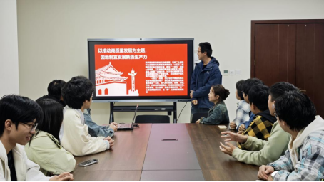 首先,姜恩镐同志带领全体成员学习党的二十届四中全会精神,并结合物理学科特色阐释“科技自立自强”对青年学子的时代召唤。姜恩镐提到,党的二十届四中全会把推动高质量发展确定为“十五五”时期经济社会发展的主题,其核心在于加快高水平科技自立自强,积极发展新质生产力。经过姜恩镐的分享,与会成员对二十届四中全会精神有了进一步的了解。