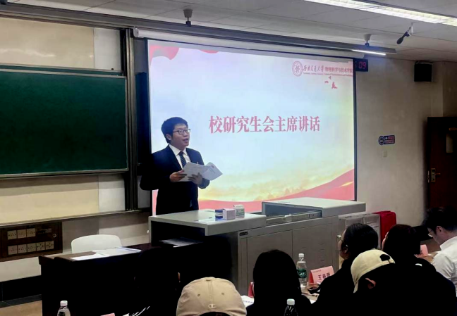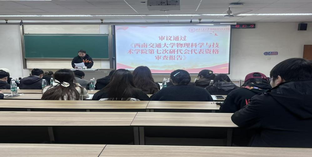 为贯彻落实党的二十届四中全会精神,贯彻落实团的十九大精神,学校第十五次党代会精神和学校第二十三次团代会,经学校团委同意,yl23411集团官网于2025年11月13日晚在九里J4218教室召开物院第七次研究生代表大会,yl23411集团官网团委书记杨昊戬老师、研究生会指导老师王春蕾老师、研究生辅导员葛田田老师、校研会主席陆江和各学院主席出席了开幕式,全体研究生代表以及研究生会成员参加了大会。