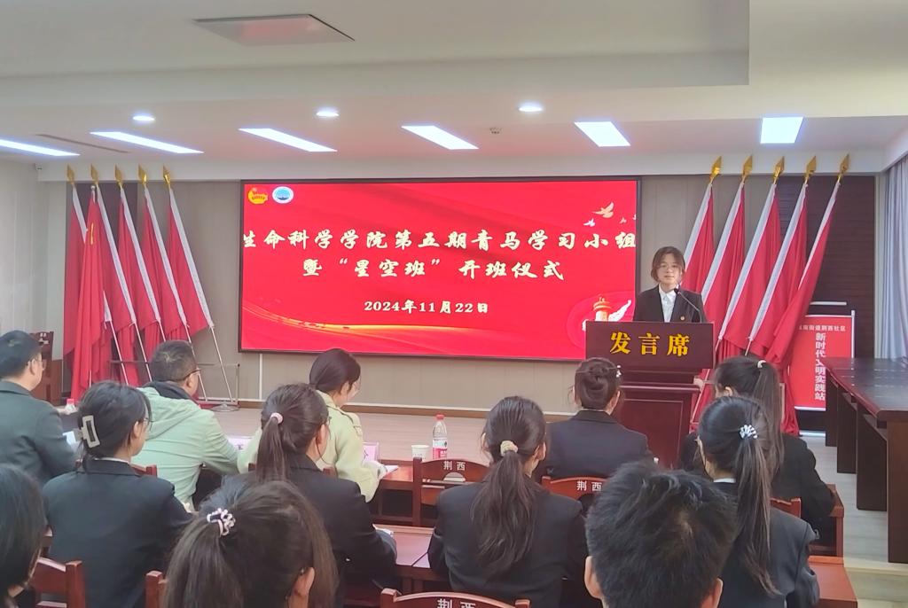 (通讯员 周煜奔 郭家惠 李敏)11月22日下午2时,生命科学学院在荆州区城南街道荆西社区举行第五期青马学习小组暨“星空班”开班仪式。荆西社区党委副书记张晓军,生命科学学院党委副书记万波、学工办主任朱翠玲、团委书记李敏、青马学习小组全体学员以及团委学生会成员代表参加会议。
