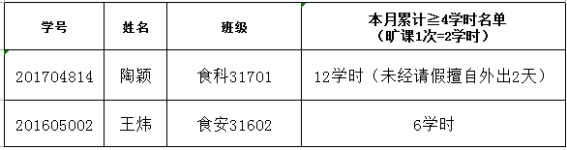 根据课堂考勤结果,累计旷课2学时的,16名同学;累计旷课4学时及以上的(旷课1次=2学时),2名同学。严肃校风校纪,督促学生按时到课,及时教育违纪学生,根据《长江大学学生违纪处分办法》第十五条、《生命科学学院课堂考勤实施办法》,经学工办研究决定,对本月累计旷课4学时以上同学予以通报批评: