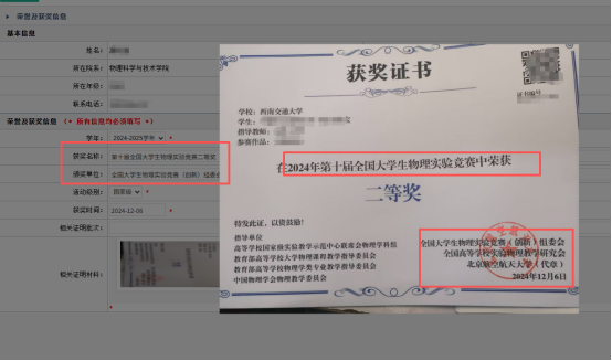 学年勾选2024-2025学年,获奖名称、获奖单位按照获奖证书或相关成绩证明填写完整,不得简写或缩写,相关证明材料需上传获奖证书或相关成绩证明(扫描版),示例如下: